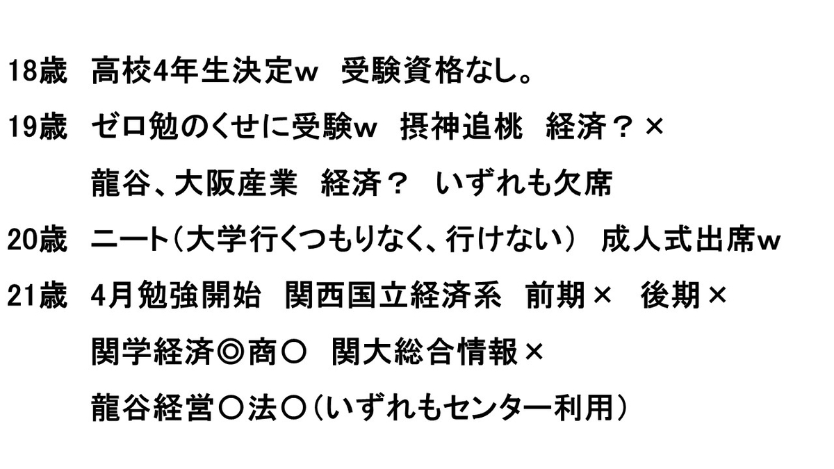 宅浪すらしていないが、一浪時に産近甲龍の夜間を受け不合格。大学へは行かず。